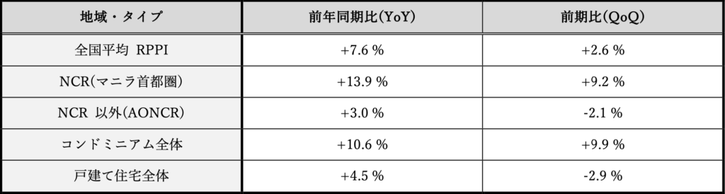 - マニラ首都圏(NCR):前年同期比 +13.9%、前期比 +9.2%と非常に力強い上昇